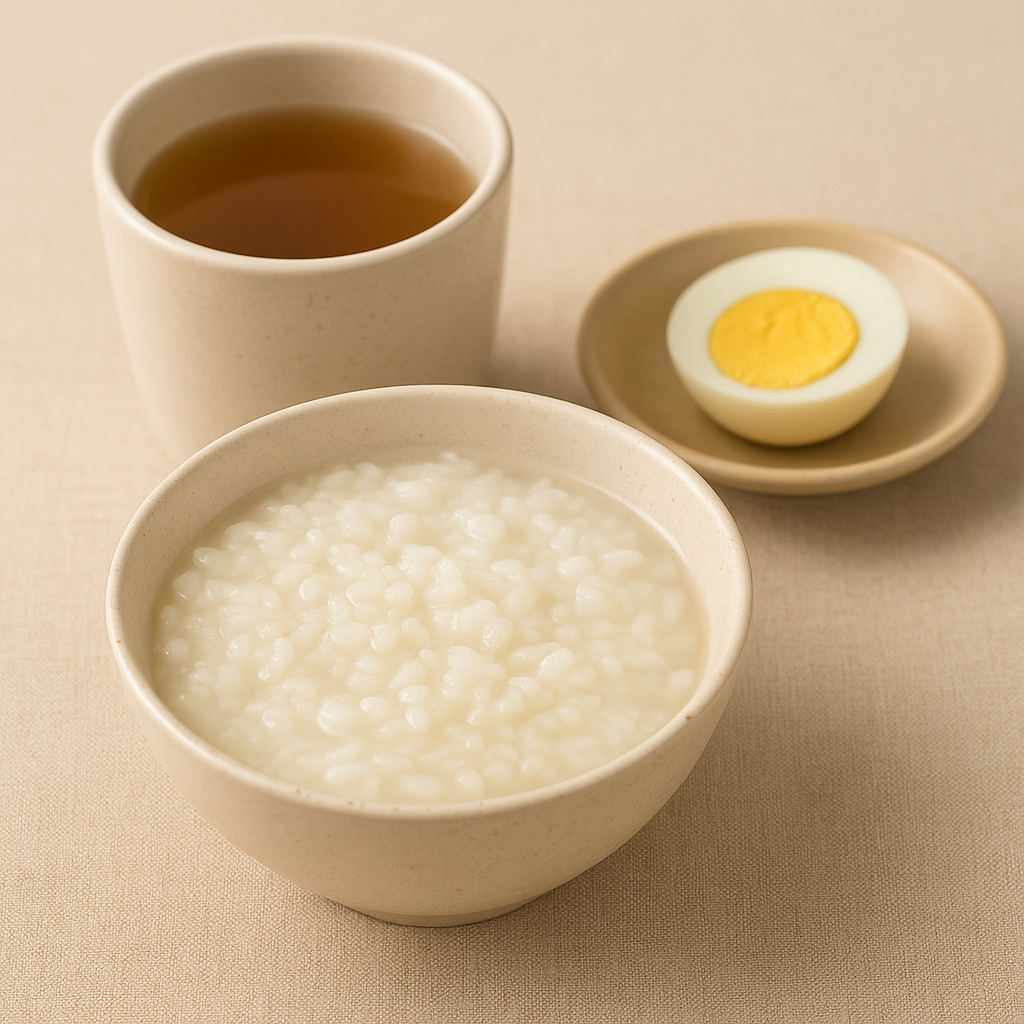 🥣 1. 따뜻한 보리차 + 흰죽 + 삶은 달걀 1개