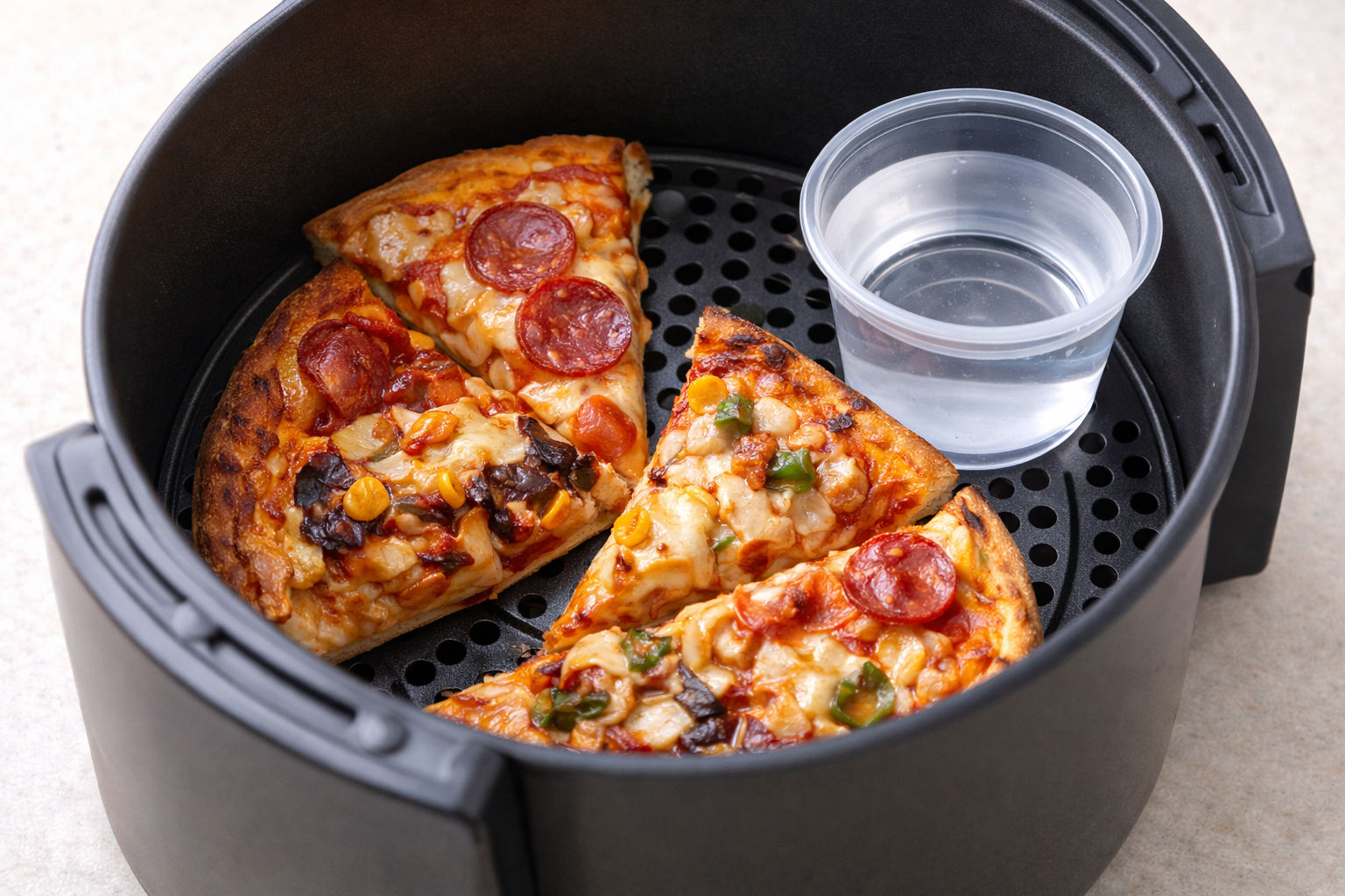 방법: 피자 옆에 에어프라이어용 작은 그릇에 물을 살짝 담아 같이 넣어주세요. (혹은 바스켓 바닥에 물을 몇 방울 뿌려주셔도 됩니다.)