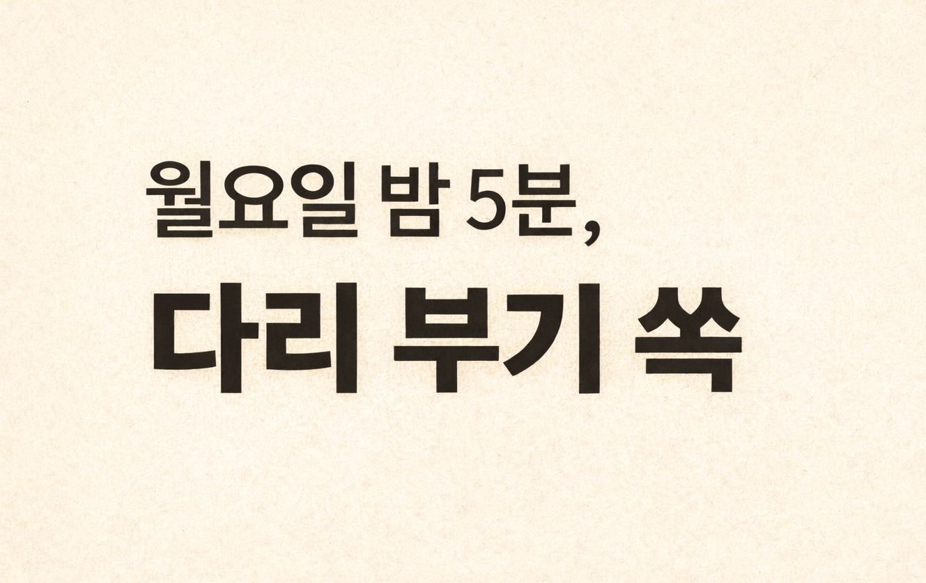 아침 일찍 공복 루틴과 건강한 식단으로 활기찬 하루를 시작하셨겠지만, 바쁜 업무나 학업, 그리고 온종일 서 있거나 앉아 있는 자세 때문에 저녁이 되면 다리가 퉁퉁 붓고 몸이 천근만근 느껴지실 거예요. 특히 월요일 밤은 주말의 피로가 몰려오면서 부기가 가장 심해지는 시간입니다.