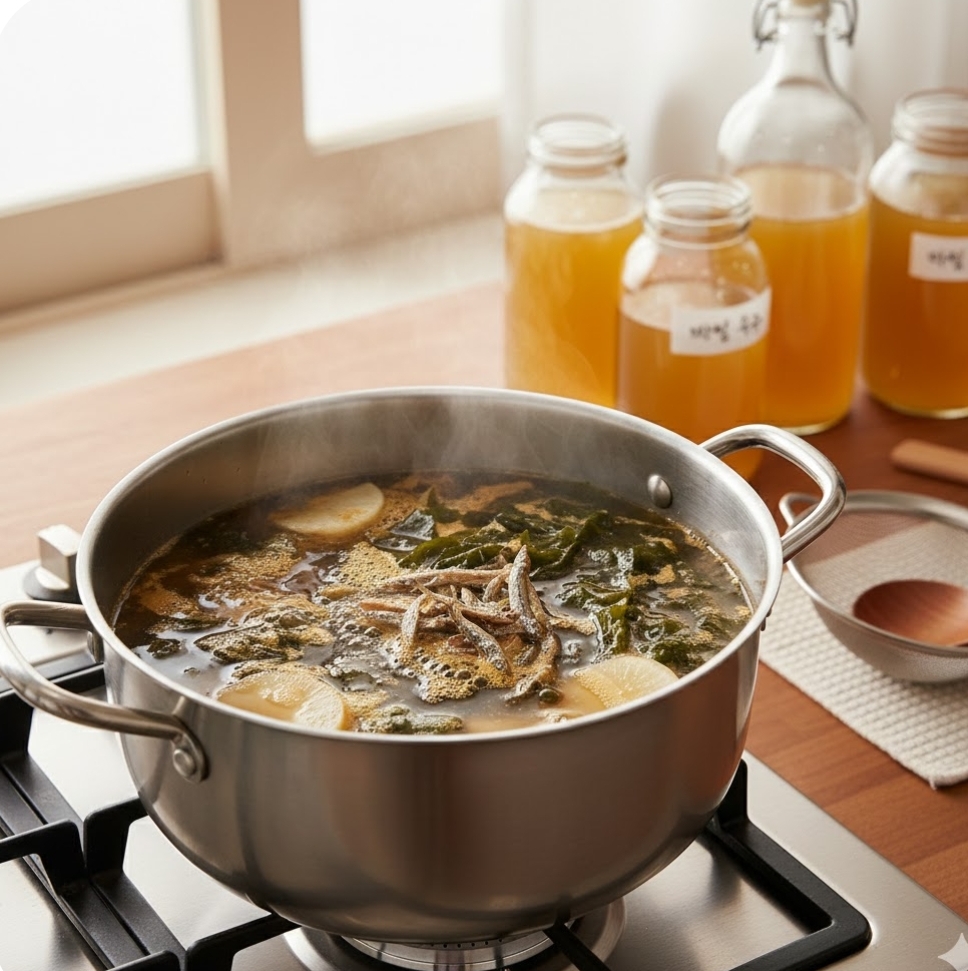 월요일 아침부터 멸치 똥 따고 다시마 우려서 육수 끓일 시간, 솔직히 없잖아요. 바쁜 아침, 5분 만에 뚝딱 국을 완성하고 싶다면 일요일 저녁에 미리 **'만능 육수'와 '핵심 양념장'**을 준비해 두는 것이 답입니다.