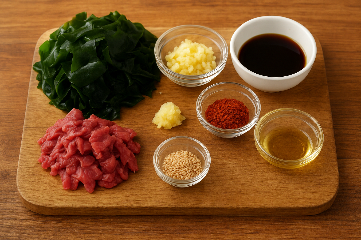 불린 미역 한 줌, 소고기 100g, 다진 마늘 1스푼, 국간장 1스푼, 참치액젓 0.5t, 참기름 1스푼, 들깨가루 2스푼, 물 800ml
