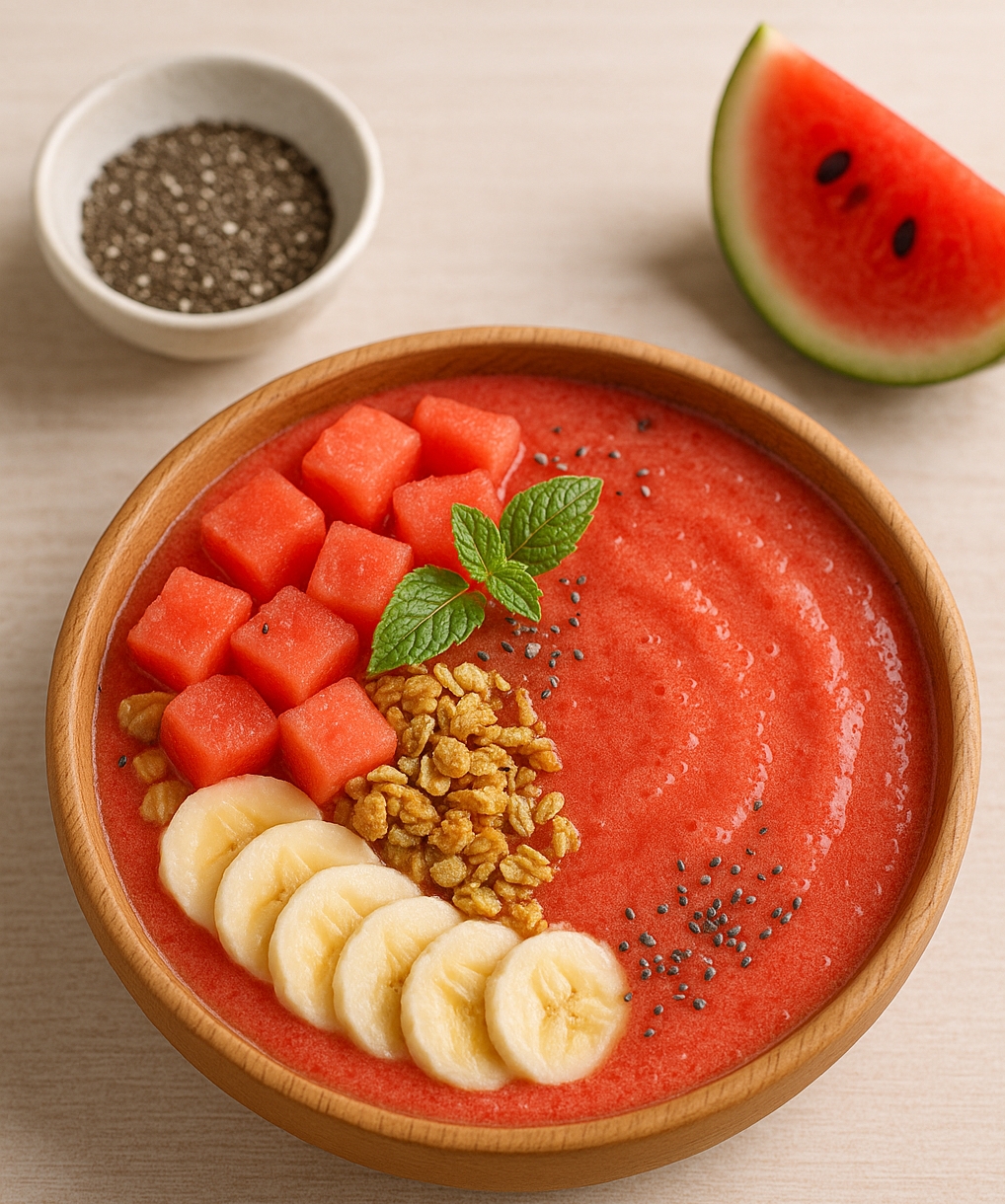 냉동 수박과 바나나를 갈아 요거트 위에 얹고, 오트밀이나 견과류를 뿌리면 영양 가득한 다이어트 한 끼로도 충분해요!