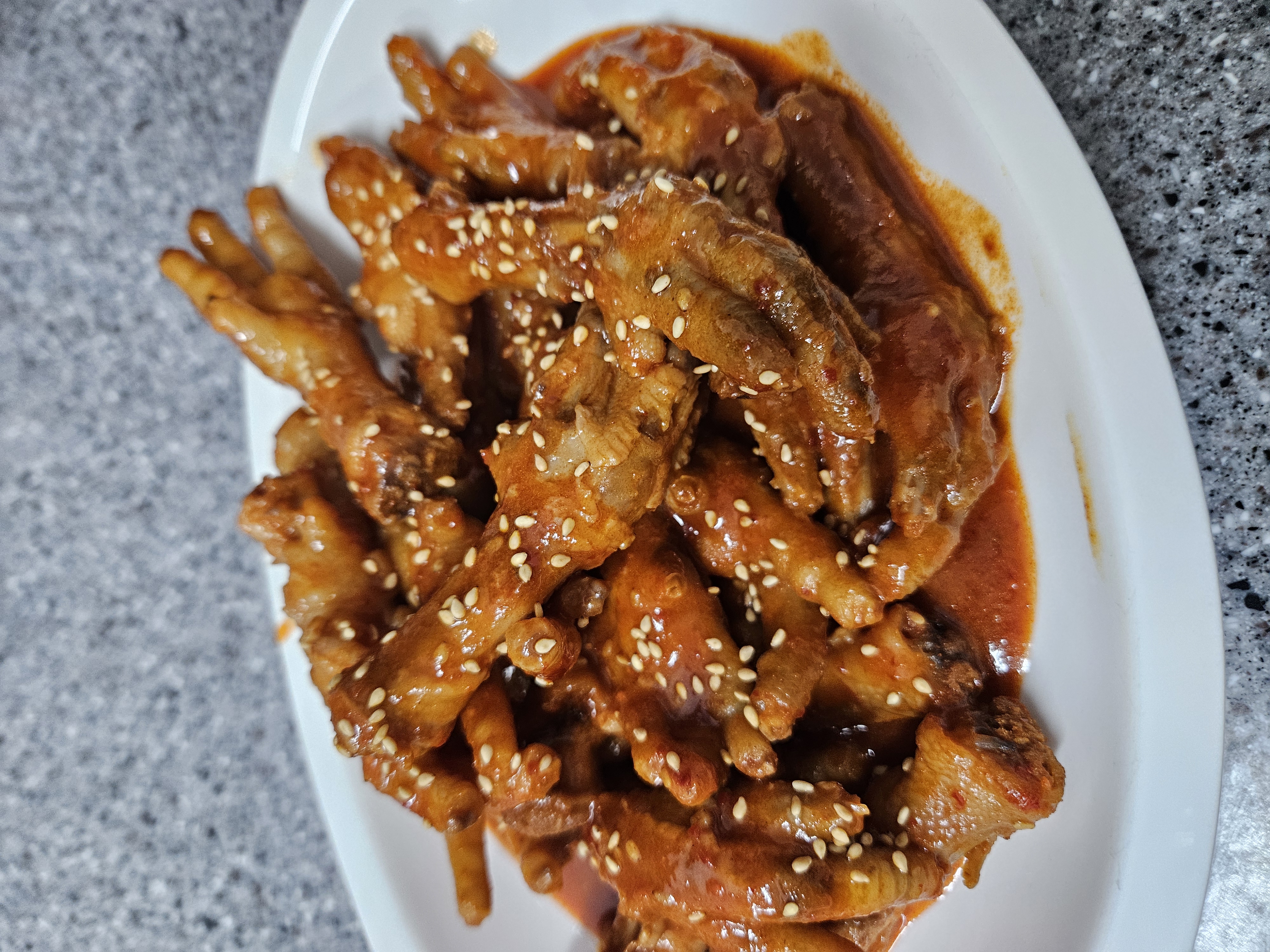 그 과정을 3번 반복하면 윤기가 좌르르 도는 매운 닭발이 완성돼요..