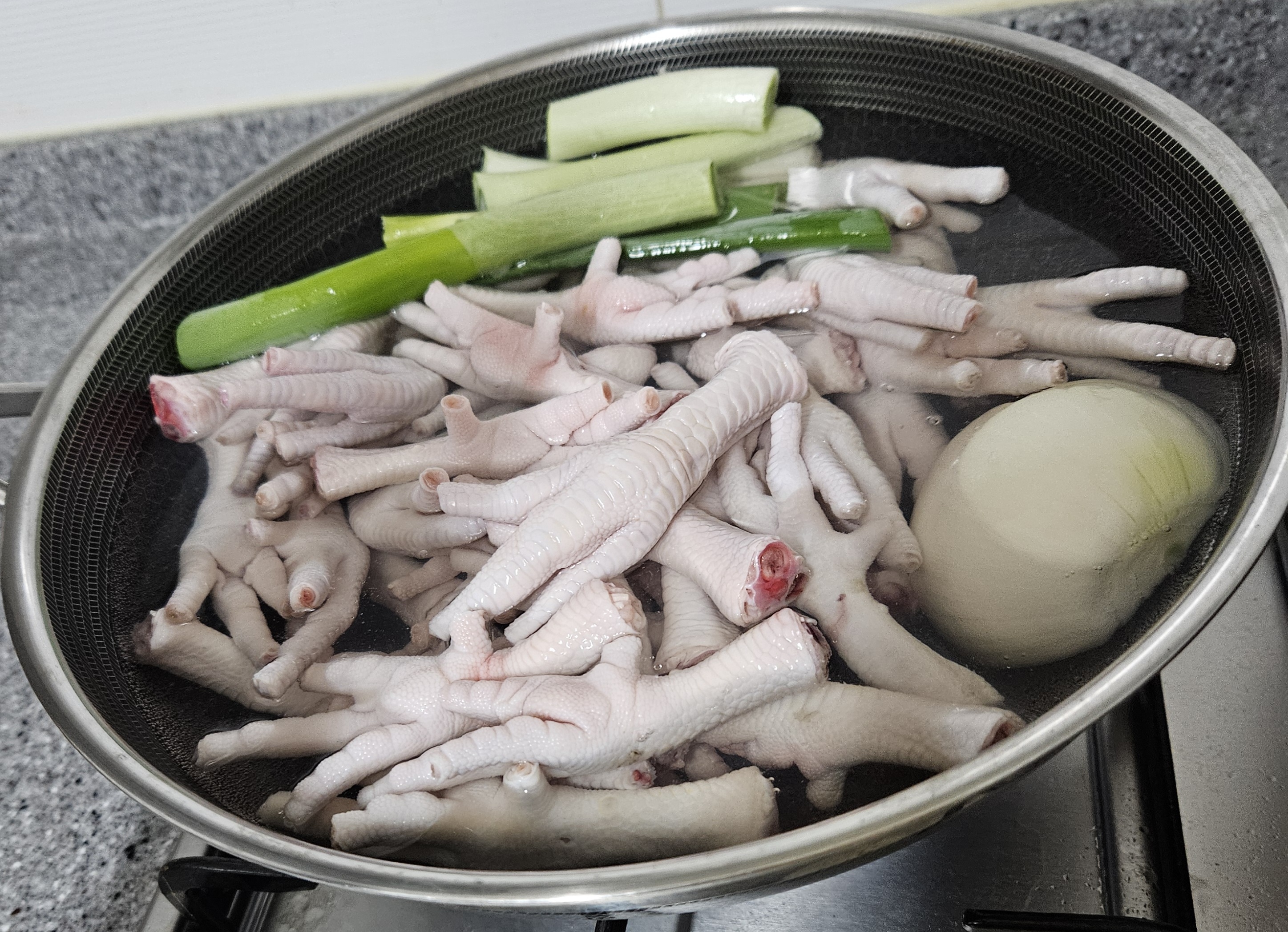 닭발은 먼저 깨끗이 손질해서 맛술과 통후추를 넣은 물에 12분 정도만 삶아요.