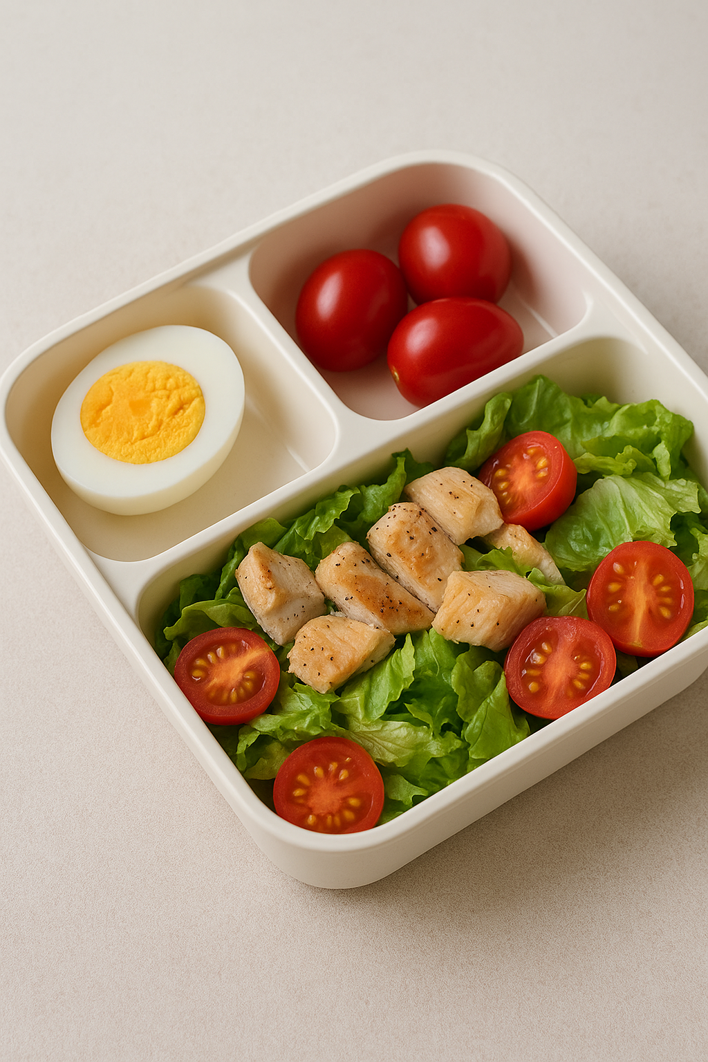 준비 재료 : 닭가슴살(훈제 or 삶은 것), 로메인·양상추, 오이, 방울토마토, 삶은 달걀